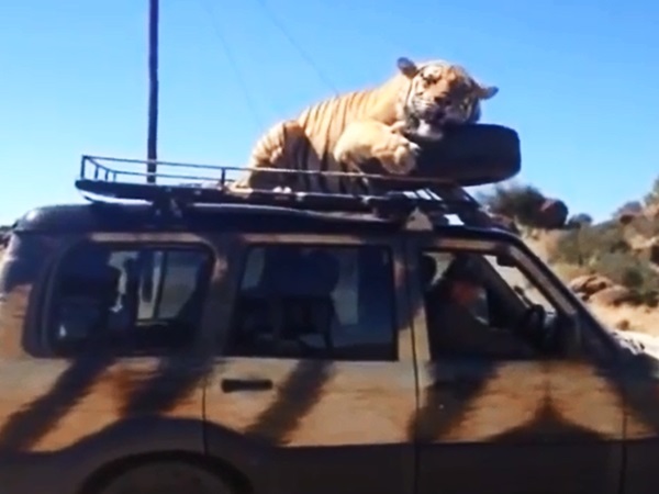 தென் ஆப்ரிக்காவிலுள்ள ஜான் வர்திஸ் புலிகள் சரணாலயம் பிரபல சினிமா தயாரிப்பாளர் ஜான் வர்திஸுக்கு சொந்தமானது. அவர் தனது மஹிந்திரா ஸ்கார்ப்பியோ எஸ்யூவியில் சரணாலயத்தை வலம் வந்தார். அப்போது, ஒரு இடத்தில் காரை நிறுத்தியிருந்தபோது, அங்கு மெதுவாக வந்த புலி ஒன்று காரின் மீது ஏறி லாவகமாக படுத்துக் கொண்டது.