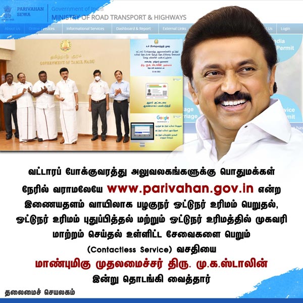 இதனை தமிழக முதலைச்சர் முக ஸ்டாலின் இன்று (ஏப்ரல் 12) தொடங்கி வைத்தார். இதுகுறித்து தமிழக அரசு வெளியிட்டிருக்கும் அறிக்கையில், "மக்கள் வட்டார போக்குவரத்து அலுவலகங்களுக்கு வராமலேயே பழகுநர் ஓட்டுநர் உரிமம் பெற்றல், ஓட்டுநர் உரிமத்தை புதுப்பித்தல் மற்றும் டிரைவிங் லைசென்ஸில் இருக்கும் முகவரியை மாற்றுதல் உள்ளிட்ட சேவைகளை ஆன்லைன் வாயிலாக பெற்றுக் கொள்ளலாம்" என தெரிவித்துள்ளது.