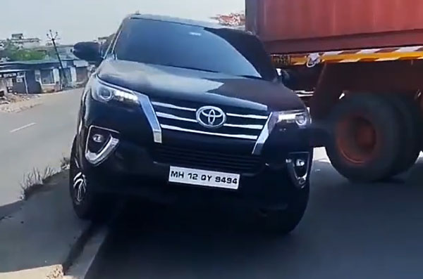 ஆனால் ஒரு ஃபார்ச்சூனர் கார் மட்டும் 'தான் ஹீரோ' என்பது போல் லாரிக்கும் சாலையின் மத்திய சுவருக்கும் இடையில் இருந்த குறுகிய இடத்தில் நுழைந்து செல்கிறது. கார் செல்வதற்கு போதிய இடம் இல்லை. இதனால் இந்த ஃபார்ச்சூனரின் ஓட்டுனர் காரின் ஒரு பக்க சக்கரங்களை சாலையின் மத்தியில் சுவற்றின் மீது ஏற்றி சென்றுள்ளார்.