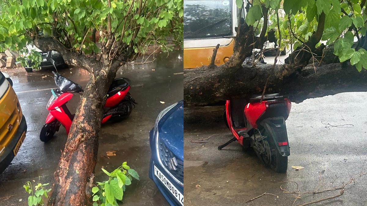 கனமழை உடன் சேர்த்து, இடி, மின்னலும் பெங்களூர் மக்களை பயமுறுத்தி வருகிறது. இதனால், பெங்களூருக்கு மஞ்சள் நிற எச்சரிக்கை விடப்பட்டு உள்ளது. கனமழையினால் பெங்களூரில் வலுவற்று கிடந்த மரங்கள் ஒன்றன்பின் ஒன்றாக சாய்ந்து வருகின்றன. அந்த வரிசையில் தற்போது, மரம் ஒன்று சாலையின் ஓரத்தில் நிறுத்தி வைக்கப்பட்டிருந்த ஏத்தர் 450 எலக்ட்ரிக் ஸ்கூட்டர் மீது விழுந்துள்ளது.