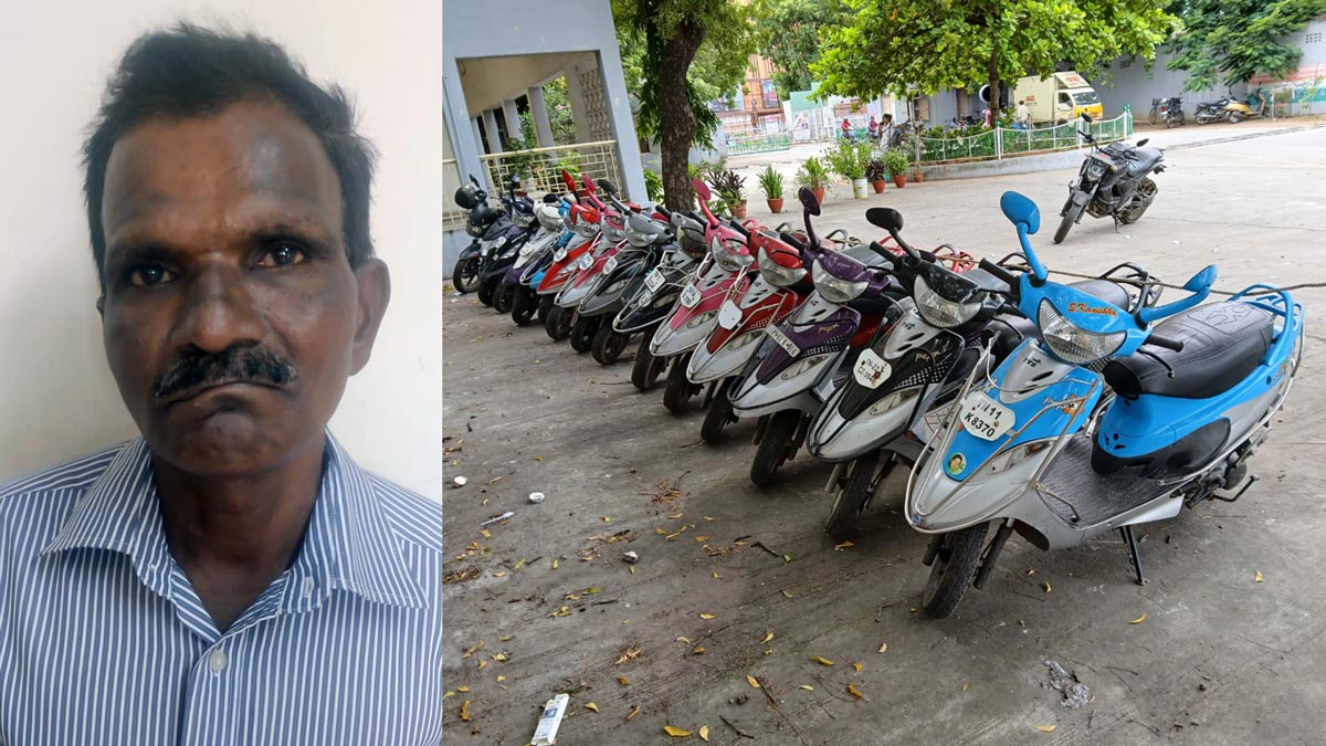 இதில் அவர்தான் சென்னை பகுதியில் பல இடங்களில் டிவிஎஸ் ஸ்கூட்டி பெப் ஸ்கூட்டரை குறி வைத்து திருடியது தெரியவந்தது. இதையடுத்து போலீசார் அவர் திருடிய வாகனங்களை மீட்டார்கள். அவர் வீட்டில் பதுக்கி வைத்திருந்த ஐந்து வாகனங்களையும் அவர் ஏற்கனவே விற்பனை செய்த ஒன்பது வாகனங்களையும் போலீசார் மீட்டனர்.