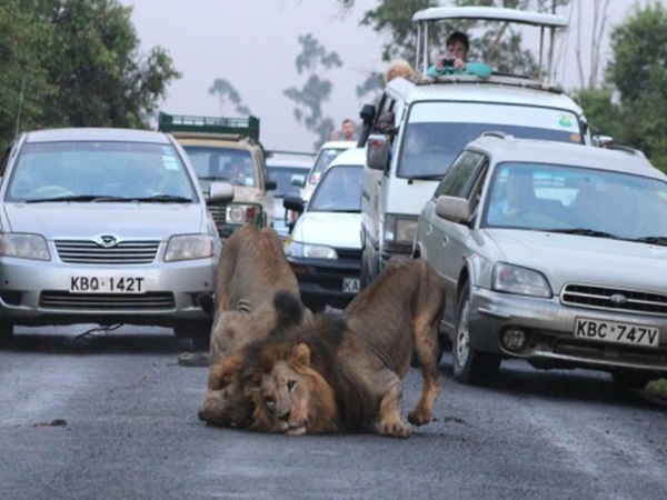 கென்ய தலைநகர், நைரோபி அருகில் நடுரோட்டில் 2 சிங்கங்கள் படுத்து உருண்டு விளையாடிதால் போக்குவரத்து தடைப்பட்டதுடன் பெரும் வாகன நெரிசலும் ஏற்பட்டது. கென்ய தலைநகர் நைரோபியிலிருந்து 4 கிலோமீட்டர் தொலைவில்தான் தேசிய வனவிலங்கு பூங்கா அமைந்துள்ளது. இந்த நிலையில், நைரோபியின் அருகில் உள்ள ஒரு முக்கிய சாலை ஒன்றில் காட்டுக்குள் இருந்து வெளியே வந்த 2 சிங்கங்கள் நேற்று படுத்து உருண்டு விளையாடிக் கொண்டிருந்தன.