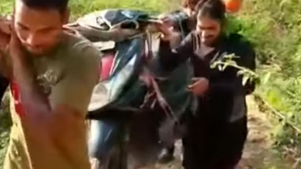 உத்தரகாண்ட் மாநிலம் பித்தோராகர் நகரத்திற்கு அருகே உள்ள இந்த கிராமத்தில் சரியான சாலை இல்லாததினால் இளைஞர்கள் சிலர் தங்களது யமஹா ரே-இசட் ஸ்கூட்டரை தாங்களே தோளில் சுமந்து சென்றுள்ளனர். நியுஸ்18 வைரல்ஸ் என்ற யுடியூப் சேனலில் பதிவிடப்பட்டுள்ள இந்த வீடியோ இணையத்தில் உண்மையில் வைரலாகி வருகிறது.