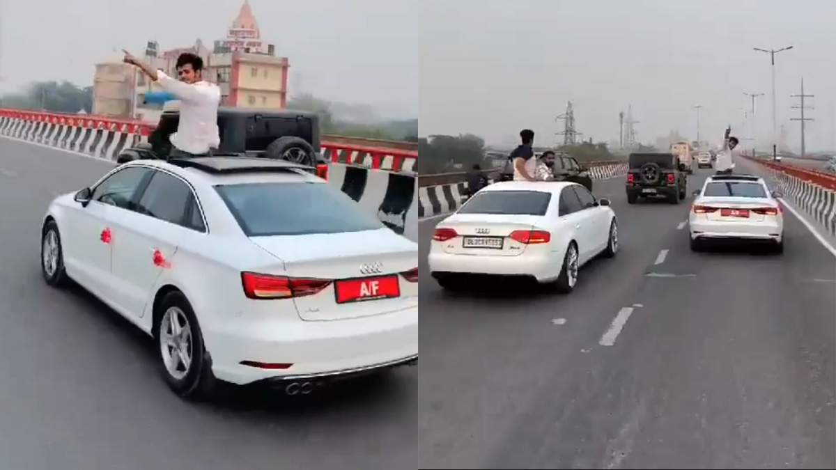 அந்த வரிசையில், தலைநகர் டெல்லிக்கு அருகே உத்திர பிரதேச மாநிலம், நொய்டாவில் இளைஞர்கள் சிலர் சொகுசு கார்களில் சன்ரூஃப் வழியாக எட்டி பார்த்தப்படி பயணம் செய்துள்ளனர். இதில் குறிப்பாக ஆடி காரில் பயணம் செய்த இளைஞர் ஒருபடி மேலே சென்று, காரின் மேற்கூரையில் அமர்ந்தப்படி பயணம் செய்துள்ளார்.