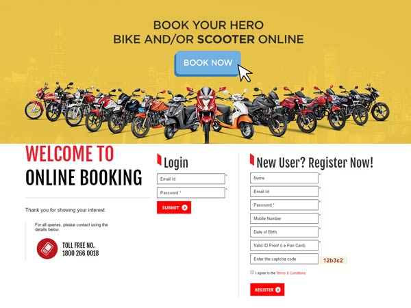 ஹீரோ மோட்டோகார்ப் நிறுவனம் வழங்கும் பைக் மற்றும் ஸ்கூட்டர் உள்ளிட்ட இரு சக்கர வாகனங்களை, ஹீரோ நிறுவன இணையதளத்தில் வாங்க, ஹீரோ நிறுவன அலுவல் ரீதியான இணையதளத்திற்கு செல்ல வேண்டும்.