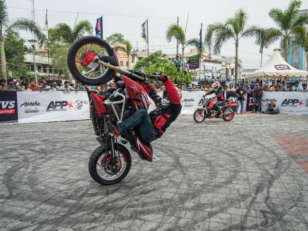 அப்பாச்சி புரோ பெர்ஃபார்மென்ஸ் எக்ஸ் என்ற பெயரில் நடத்தப்பட்ட இந்த சாகச நிகழ்ச்சி சென்னை எக்ஸ்பிரஸ் அவென்யூ வணிக வளாகத்தில் நடந்தது. இதில், டிவிஎஸ் நிறுவனத்தின் 5 சாகச அணிகள் பங்கு கொண்டன.