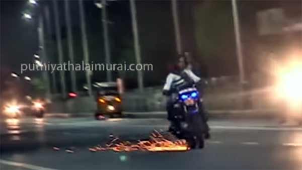 மேலும் சாலையில் செல்லும் போது முன் வீலை தூக்கி பைக் ஓட்டுவது, பைக்கை நிறுத்தும் போது ஸ்டாப்பி செய்வது, பைக்குகளில் வேகமாக செல்லும் போது ஏதேனும் இரும்பு பொருளை தரையில் உரசும்படி வைத்து அதன் மூலம் தீப்பொறிகளை கிளப்பி கொண்டே செல்வது என இளைஞர்கள் விதவிதமான சாகசங்களில் இறங்கிவிட்டனர்.