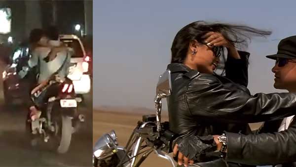 ஆனால் படத்தில் வருவது போல் அவர்கள் பாடவில்லை. அது ஒன்றுதான் குறை. பைக் ஓட்டி சென்ற இளைஞர் தனது தோள்பட்டையில் பேக் ஒன்றை அணிந்திருந்தார். அப்போது அந்த இளம்பெண் பைக்கின் பெட்ரோல் டேங்க் மீது அமர்ந்து கொண்டு அந்த இளைஞரை கட்டியணைத்து கொண்டே பயணித்தார்.