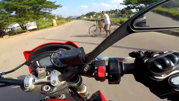 அதே சமயம் இந்த வீடியோவின் இரண்டாவது பகுதியி இந்திய சாலைகளில் அதிவேகத்தில் பயணிப்பதில் இருக்கும் ஆபத்துக்கள், இடையூறுகளை காட்டுகிறது. ஒரு கட்டத்தில் அந்த ரைடர் மணிக்கு 200 கிலோ மீட்டர் வேகத்தை கடந்து விட்டார். அந்த பைக் மணிக்கு 215 கிலோ மீட்டர்கள் வேகத்தில் பயணித்து கொண்டிருந்தபோது ஒரு நபர் சைக்கிளில் திடீரென பைக்கிற்கு முன்னே வந்தார்.