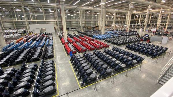 படத்தில், தொழிற்சாலைக்குள் எஸ்1 & எஸ்1 ப்ரோ எலக்ட்ரிக் ஸ்கூட்டர்கள் வேரியண்ட்கள் & நிறம் வாரியாக பிரித்து நிற்க வைக்கப்பட்டிருப்பதை காண முடிகிறது. தமிழகத்தில் 500 ஏக்கர் பரப்பளவில் பிரம்மாண்டமான தொழிற்சாலையாக கட்டமைக்கப்பட்டுள்ள ஓலாவின் ‘எதிர்கால தொழிற்சாலை' ஆனது அதிகப்பட்சமாக வருடத்திற்கு 20 லட்ச எலக்ட்ரிக் ஸ்கூட்டர்களை தயாரிக்கும் திறன் கொண்டது என கூறப்படுகிறது.