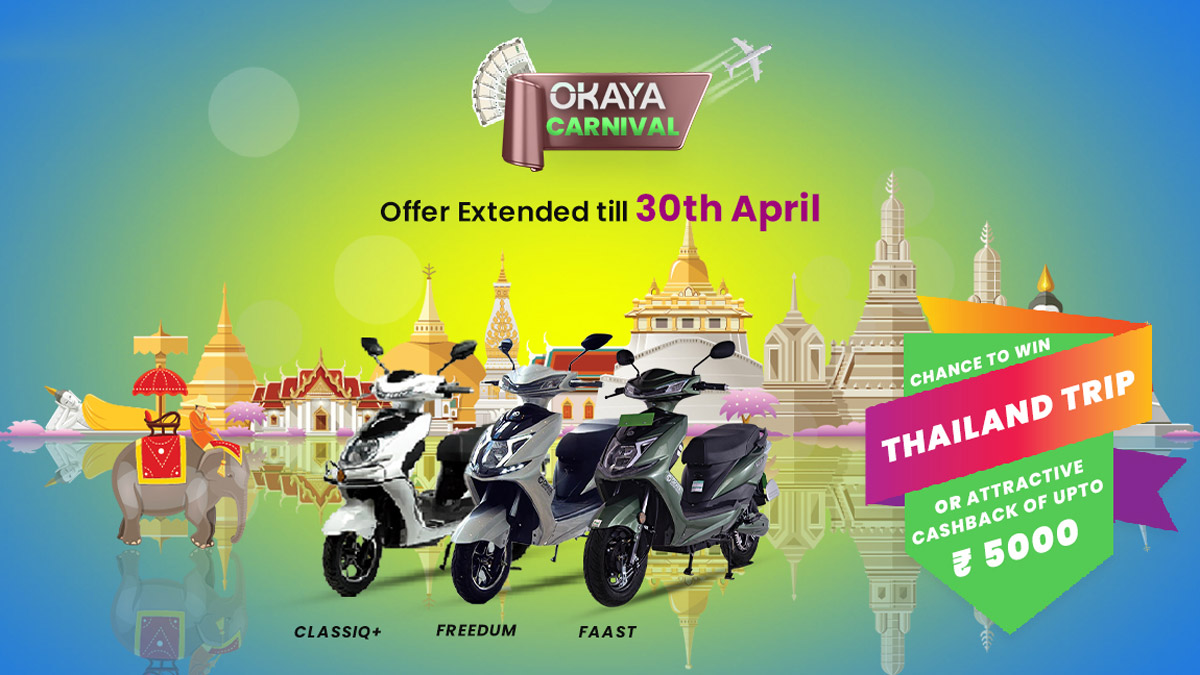 ஒகாயா நிறுவனம் அறிவித்துள்ளபடி அந்நிறுவனத்தின் இ- ஸ்கூட்டரை டெஸ்ட் டிரைவ் செய்யும் வாடிக்கையாளர்கள் ஸ்கூட்டரை வாங்கினால் ரூ1750 தள்ளுபடியாக வழங்கப்படும். இது மட்டுமல்ல இந்த ஸ்கூட்டரை வாங்கும் ஒவ்வொரு வாடிக்கையாளருக்கும் நிச்சயம் ரூ5 ஆயிரம் கேஷ்பேக் அல்லது 3 இரவு/4பகல் தாய்லாந்து சுற்றுலாவைப் பெறும் வாய்ப்பை அறிவித்துள்ளது.